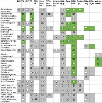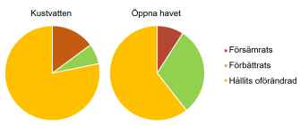 På lång sikt har eutrofieringsstatusen för kustvattnen har hållits liknande i de flesta områden och med samma indikatorer från 1990-talet till idag. I ungefär en tredjedel har läget förbättrats och huvudsakligen hållits oförändrat. Med cirka en fjärdedel av indikatorerna har läget förbättrats på öppna havet men de flesta av indikatorerna visar antingen en förändring mot en svagare riktning eller ett oförändrat läge. Statusen har förbättrats mestadels för kväveindikatorerna.